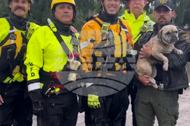 This photo provided by Ventura County Fire Department, members of VCFD and Oxnard Fire Department pose with a dog after they rescued it from a flood channel in the Oxnard plains in Ventura County, Calif., on Tuesday, Oct. 14, 2025. (Ventura County Fire Department via AP)