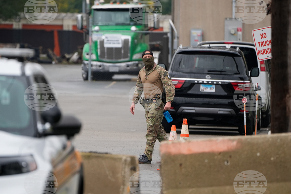 A federal agent stands outside the U.S. Immigration and Customs Enforcement building Wednesday, Oct. 15, 2025, in Broadview, Ill. (AP Photo/Erin Hooley)