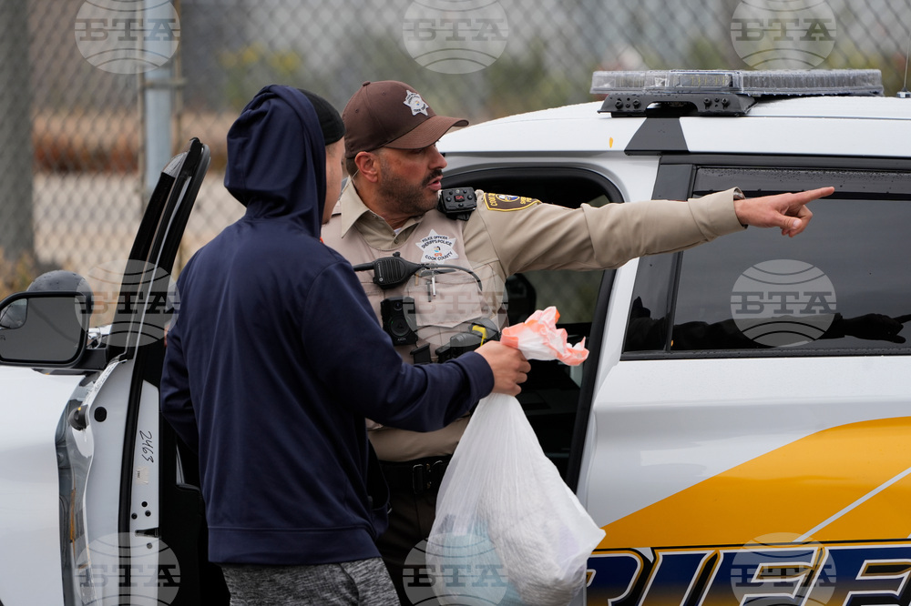 A Cook County Sheriff's deputy speaks to someone with items to drop off for a family member outside the U.S. Immigration and Customs Enforcement building Wednesday, Oct. 15, 2025, in Broadview, Ill. (AP Photo/Erin Hooley)
