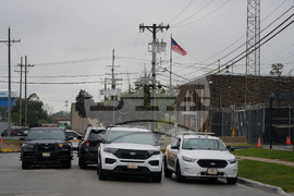 Illinois State Police and Cook County Sheriff's vehicles block the road outside the U.S. Immigration and Customs Enforcement building Wednesday, Oct. 15, 2025, in Broadview, Ill. (AP Photo/Erin Hooley)