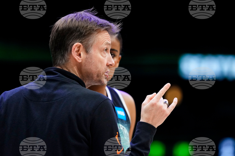 FILE - New York Liberty assistant coach Olaf Lange gives directions during the first half of a WNBA basketball game against the Seattle Storm, Tuesday, May 30, 2023, in Seattle. (AP Photo/Lindsey Wasson, File)