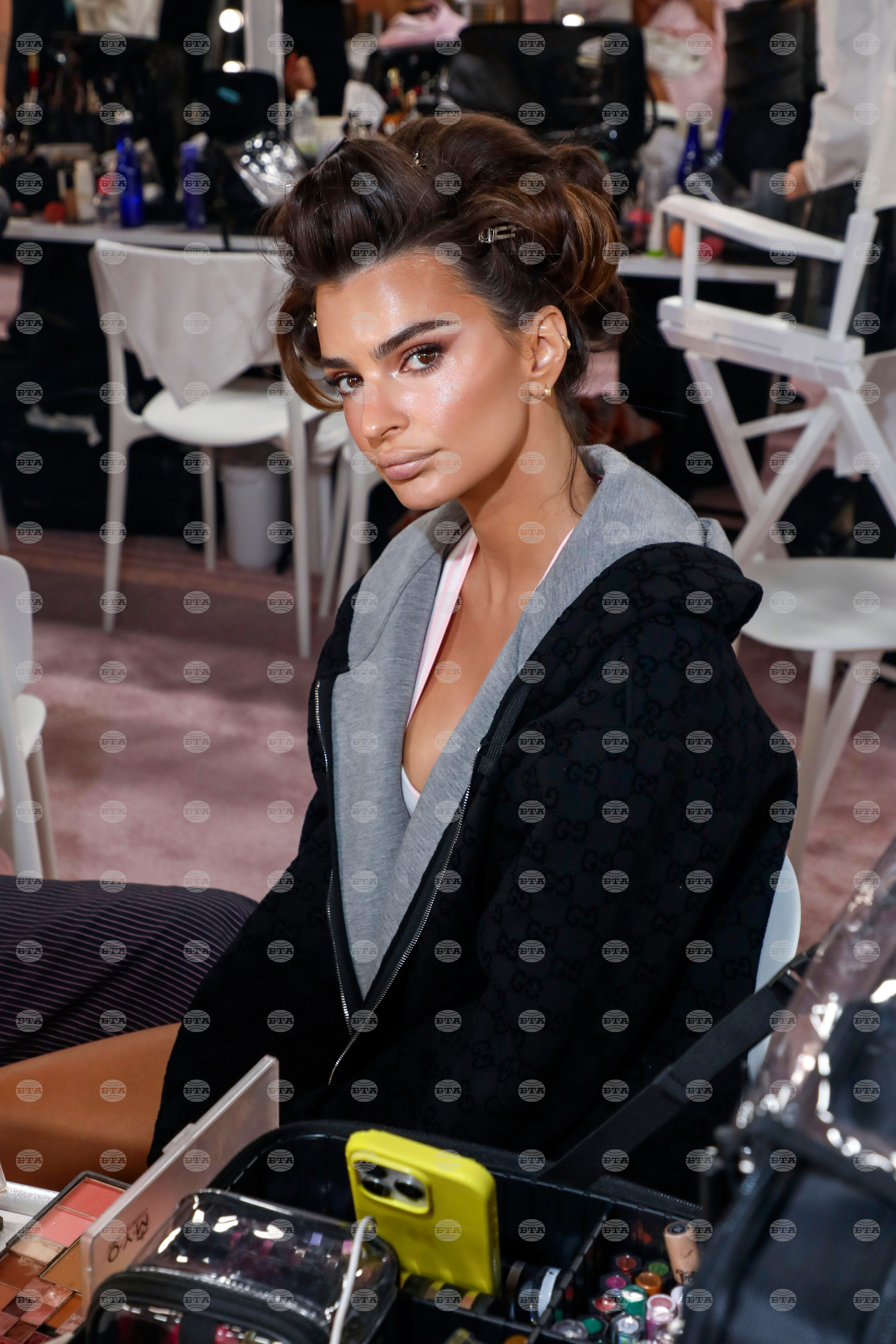 Fashion model Emily Ratajkoswki appears backstage prior to the Victoria's Secret Fashion Show on Wednesday, Oct. 15, 2025, in the Brooklyn borough of New York. (Photo by Andy Kropa/Invision/AP)
