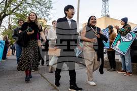 Some of the Lighthiser v. Trump youth plaintiffs make their way to the Russell Smith federal courthouse, where the young climate activists were in court challenging President Donald Trump's orders promoting fossil fuels, Sept. 17, 2025, in Missoula, Mont. (Ben Allan Smith/The Missoulian via AP)