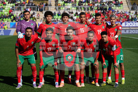 Players of Morocco pose for a group photo prior to their FIFA U-20 World Cup semifinal soccer match against France at Elias Figueroa Brander Stadium in Valparaiso, Chile, Wednesday, Oct. 15, 2025. (AP Photo/Matias Delacroix)