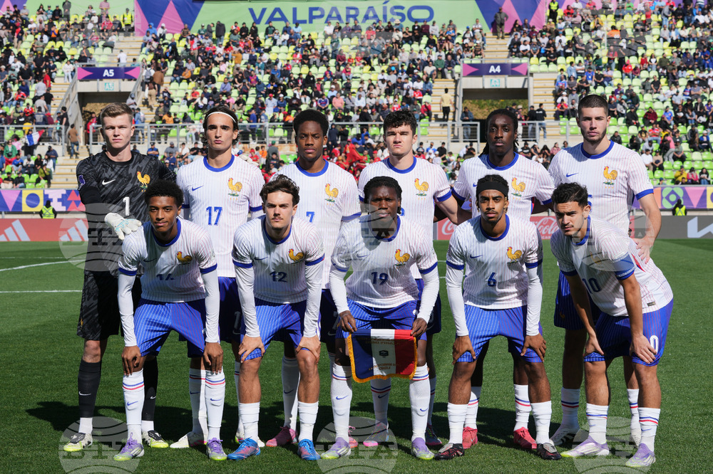 France players pose for a group photo prior to their FIFA U-20 World Cup semifinal soccer match against Morocco at Elias Figueroa Brander Stadium in Valparaiso, Chile, Wednesday, Oct. 15, 2025. (AP Photo/Andre Penner)