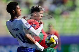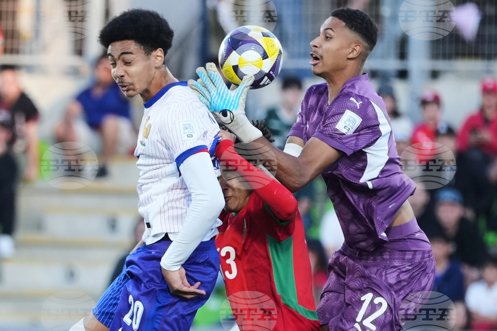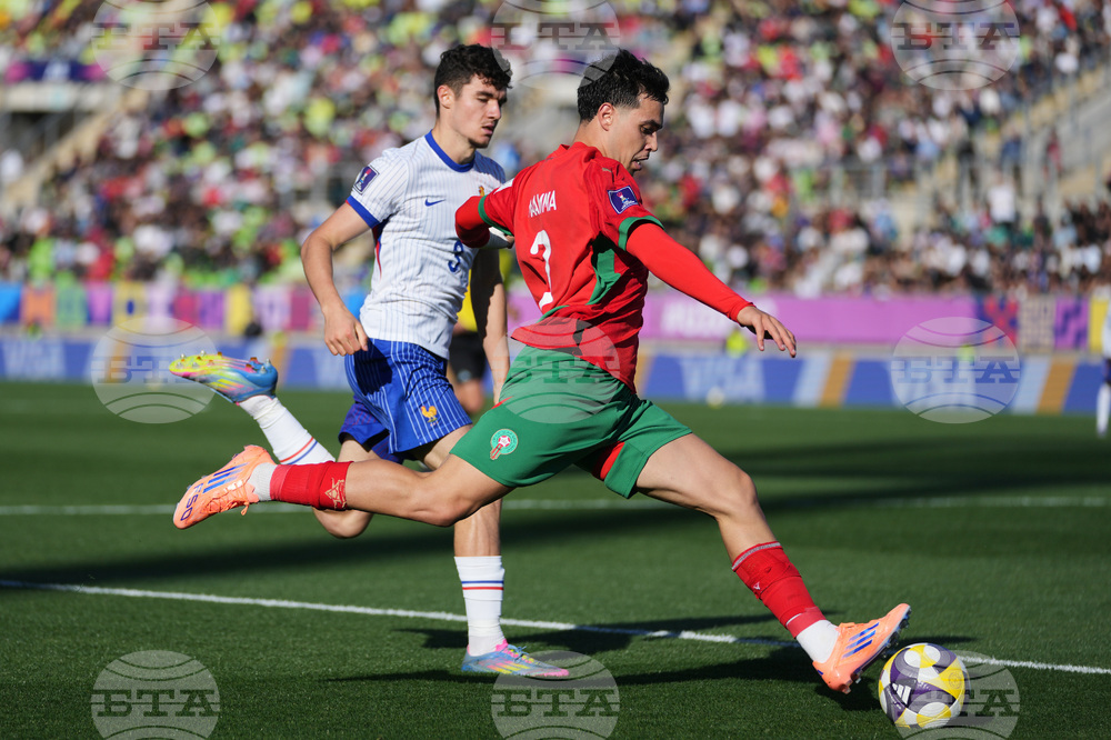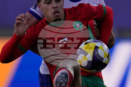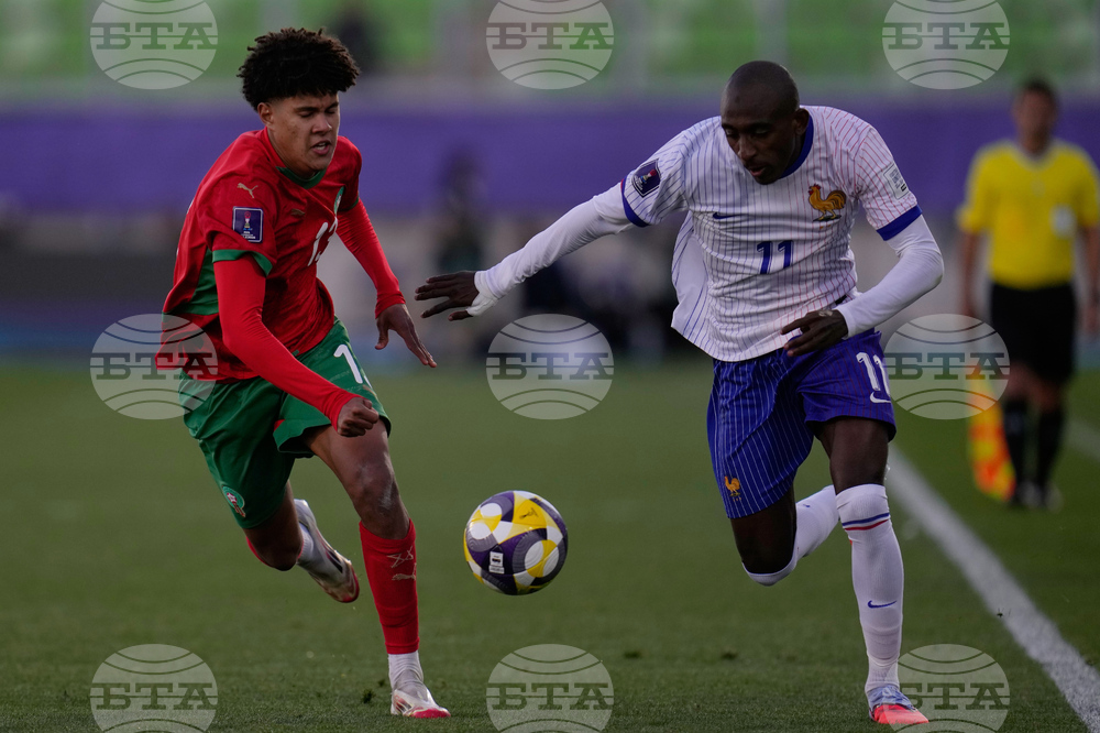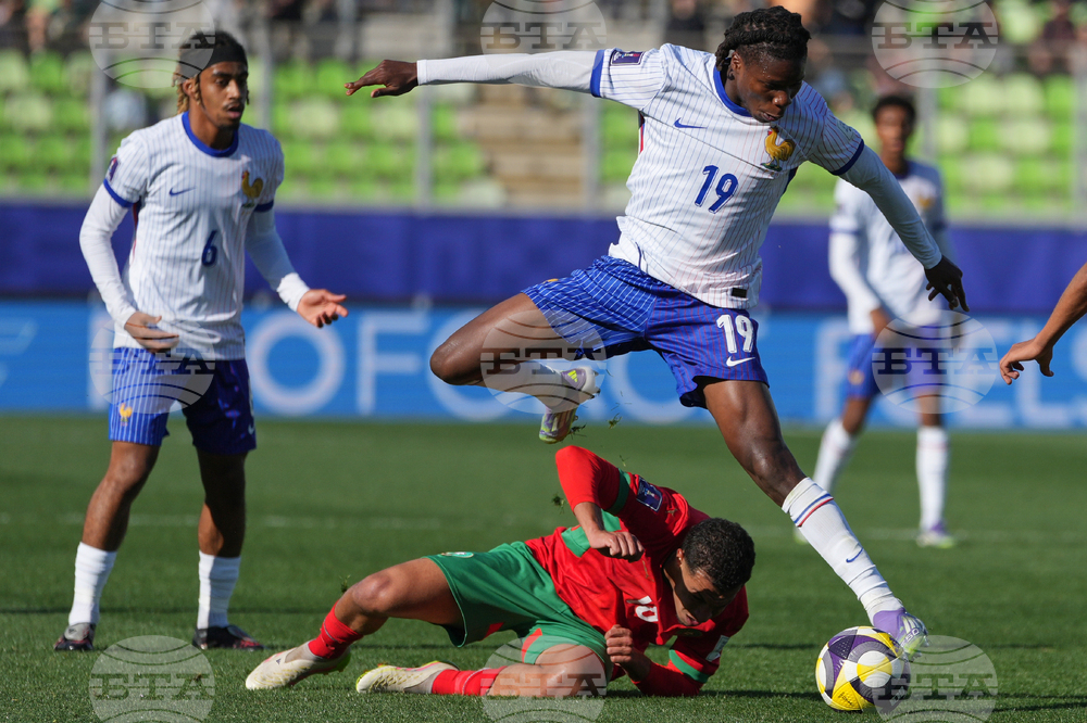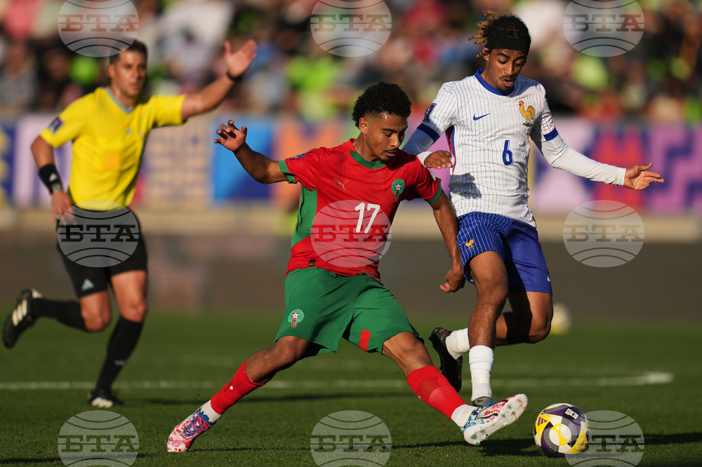 France's Gady-Pierre Beyuku, left, and Morocco's Othmane Maamma vie for the ball during a FIFA U-20 World Cup semifinal soccer match at Elias Figueroa Brander Stadium in Valparaiso, Chile, Wednesday, Oct. 15, 2025. (AP Photo/Matias Delacroix)