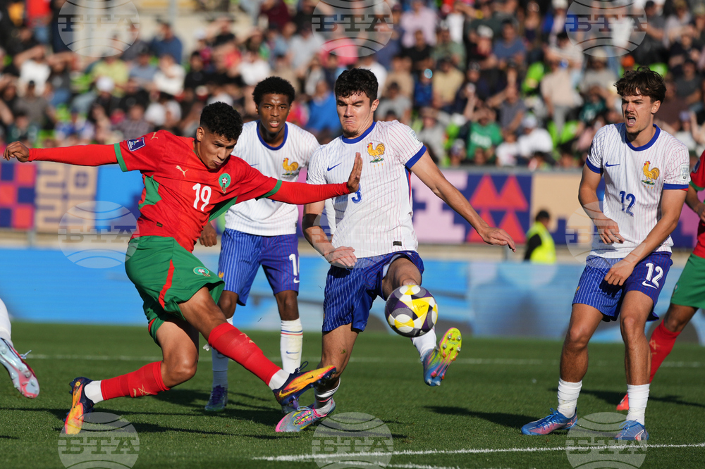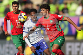 Morocco's Ismael Baouf (4) and France's Lucas Michal vie for the ball during a FIFA U-20 World Cup semifinal soccer match at Elias Figueroa Brander Stadium in Valparaiso, Chile, Wednesday, Oct. 15, 2025. (AP Photo/Andre Penner)