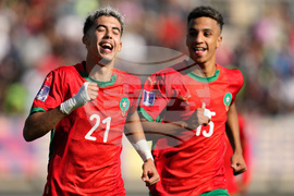 Morocco's Yassir Zabiri celebrates his side's opening goal against France during a FIFA U-20 World Cup semifinal soccer match at Elias Figueroa Brander Stadium in Valparaiso, Chile, Wednesday, Oct. 15, 2025. (AP Photo/Matias Delacroix)