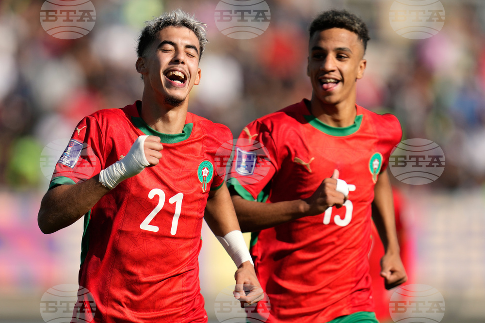 Morocco's Ilias Boumassaoudi, left, and Younes Elbahraoui celebrate defeating France in a penalty shootout during a FIFA U-20 World Cup semifinal soccer match at Elias Figueroa Brander Stadium in Valparaiso, Chile, Wednesday, Oct. 15, 2025. (AP Photo/Andre Penner)