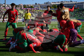 Morocco players celebrate defeating France in a penalty shootout during a FIFA U-20 World Cup semifinal soccer match at Elias Figueroa Brander Stadium in Valparaiso, Chile, Wednesday, Oct. 15, 2025.(AP Photo/Andre Penner)