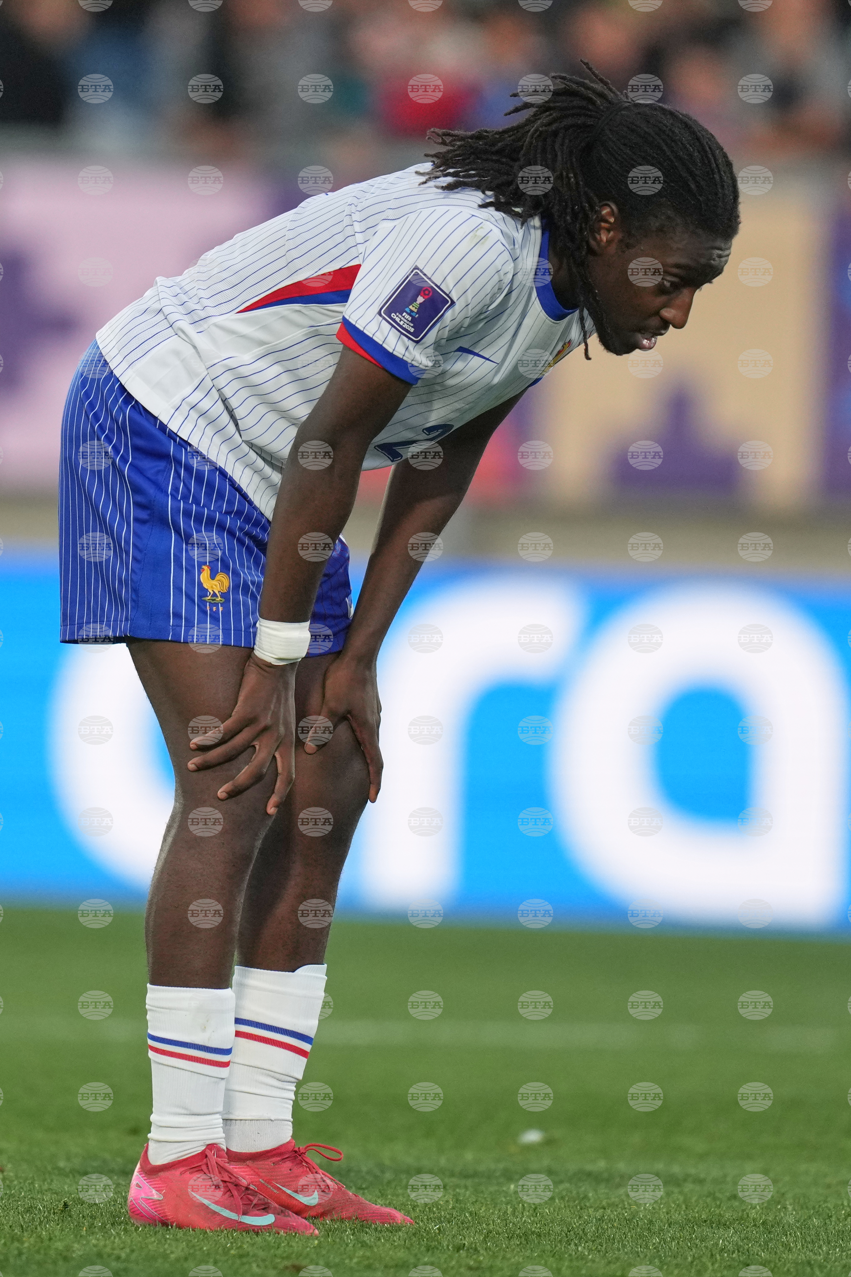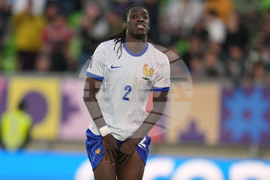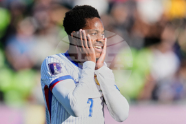 France's Lucas Michal reacts after missing a chance to score against Morocco during a FIFA U-20 World Cup semifinal soccer match at Elias Figueroa Brander Stadium in Valparaiso, Chile, Wednesday, Oct. 15, 2025. (AP Photo/Matias Delacroix)