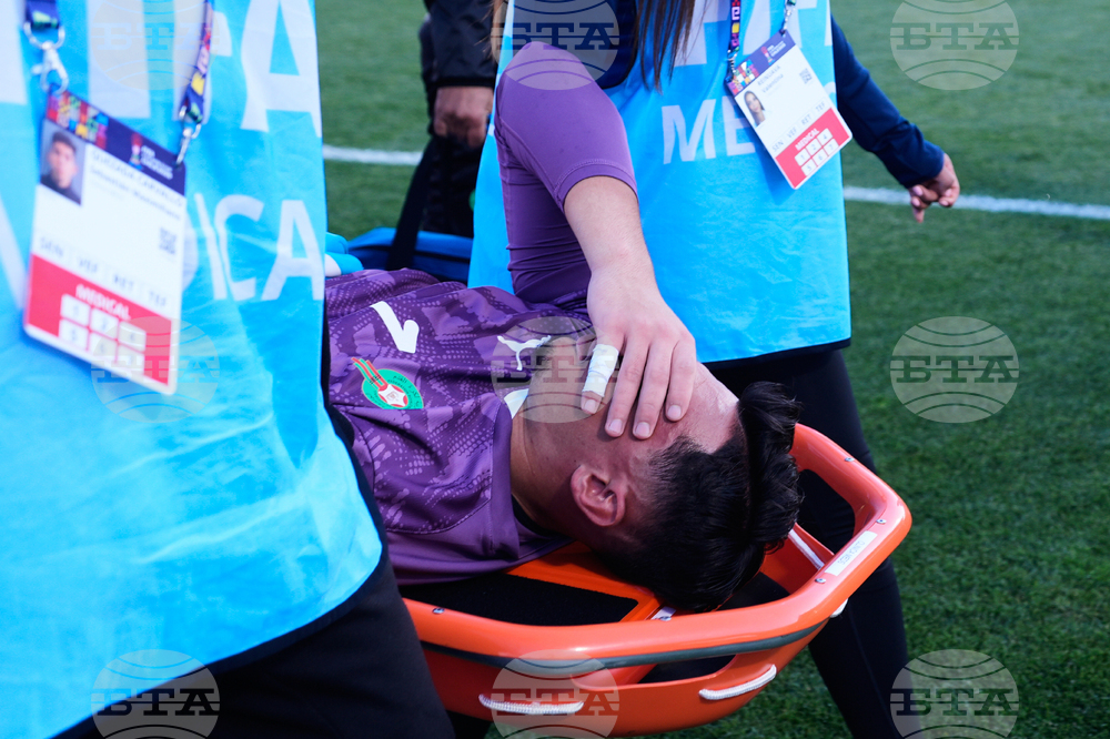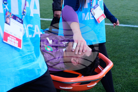 Paramedics carry Morocco's goalkeeper Yanis Benchaouch off the field during a FIFA U-20 World Cup semifinal soccer match against France at Elias Figueroa Brander Stadium in Valparaiso, Chile, Wednesday, Oct. 15, 2025. (AP Photo/Matias Delacroix)