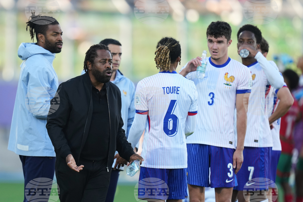 France's coach Bernard Diomede talks to Ilane Toure during a FIFA U-20 World Cup semifinal soccer match against Morocco at Elias Figueroa Brander Stadium in Valparaiso, Chile, Wednesday, Oct. 15, 2025. (AP Photo/Andre Penner)