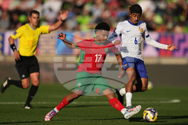 France's Noham Kamara, left, and Morocco's Yassir Zabiri battle for the ball during a FIFA U-20 World Cup semifinal soccer match at Elias Figueroa Brander Stadium in Valparaiso, Chile, Wednesday, Oct. 15, 2025. (AP Photo/Matias Delacroix)