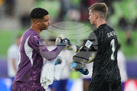 Morocco's goalkeeper Abdelhakim Mesbahi, left, and France's goalkeeper Lisandru Olmeta shake hands before a penalty shootout during a FIFA U-20 World Cup semifinal soccer match at Elias Figueroa Brander Stadium in Valparaiso, Chile, Wednesday, Oct. 15, 2025. (AP Photo/Andre Penner)