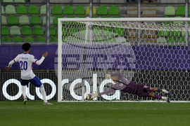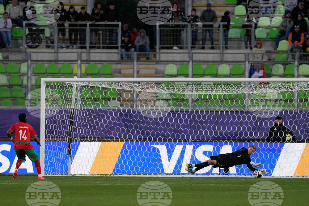 Morocco's goalkeeper Abdelhakim Mesbahi stops a penalty kick by France's Djylian Nguessan during a shootout in a FIFA U-20 World Cup semifinal soccer match at Elias Figueroa Brander Stadium in Valparaiso, Chile, Wednesday, Oct. 15, 2025 (AP Photo/Matias Delacroix)