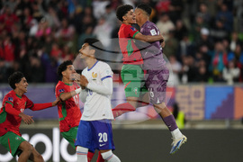 France's Justin Bourgault grabs Morocco's Othmane Maamma, front, during a FIFA U-20 World Cup semifinal soccer match at Elias Figueroa Brander Stadium in Valparaiso, Chile, Wednesday, Oct. 15, 2025. (AP Photo/Matias Delacroix)