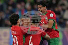 Morocco players celebrate their opening goal against France during a FIFA U-20 World Cup semifinal soccer match at Elias Figueroa Brander Stadium in Valparaiso, Chile, Wednesday, Oct. 15, 2025. (AP Photo/Matias Delacroix)
