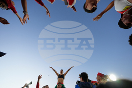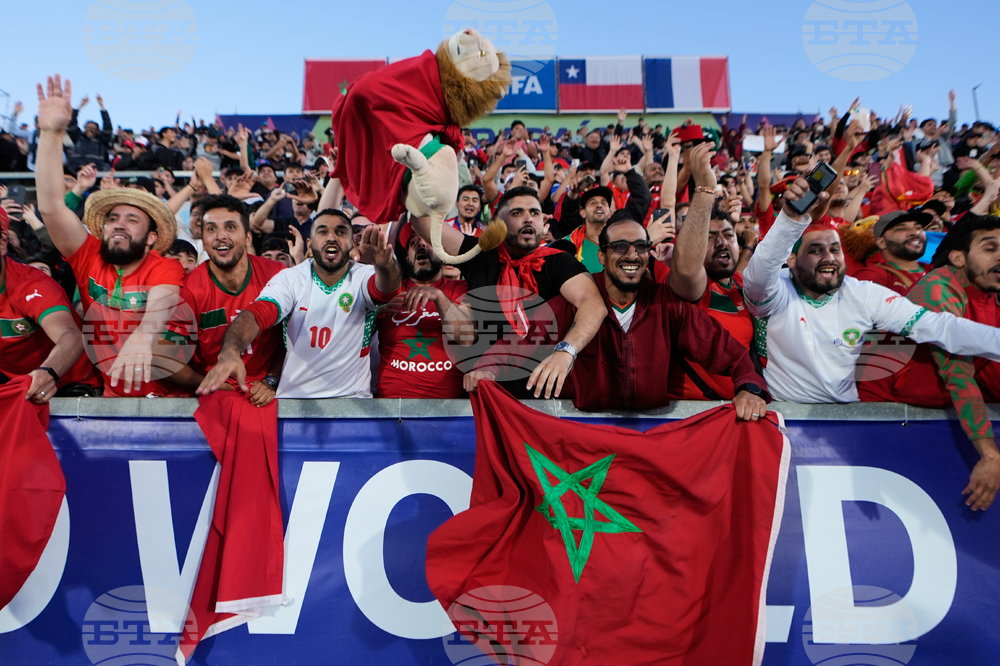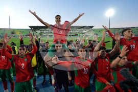 Fans of Morocco celebrates defeating France in a penalty shootout during a FIFA U-20 World Cup semifinal soccer match at Elias Figueroa Brander Stadium in Valparaiso, Chile, Wednesday, Oct. 15, 2025.(AP Photo/Matias Delacroix)