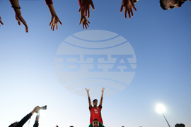 Morocco players lift their coach Mohamed Ouahbi after defeating France in a penalty shootout during a FIFA U-20 World Cup semifinal soccer match at Elias Figueroa Brander Stadium in Valparaiso, Chile, Wednesday, Oct. 15, 2025.(AP Photo/Matias Delacroix)