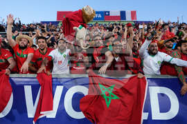 Fans of Morocco cheer during a FIFA U-20 World Cup semifinal soccer match against France at Elias Figueroa Brander Stadium in Valparaiso, Chile, Wednesday, Oct. 15, 2025. (AP Photo/Andre Penner)