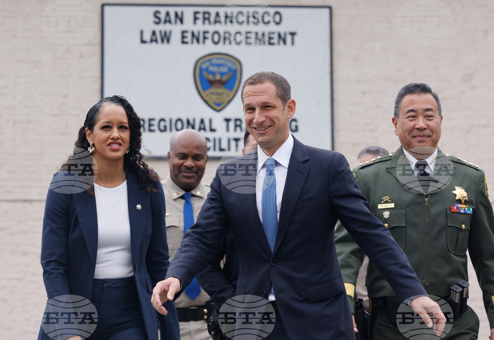 District Attorney Brooke Jenkins, front left to right, Mayor Daniel Lurie, Sheriff Paul Miyamoto and others walk to a news conference at the San Francisco Police Academy, Wednesday, Oct. 15, 2025, in San Francisco. (Lea Suzuki/San Francisco Chronicle via AP)
