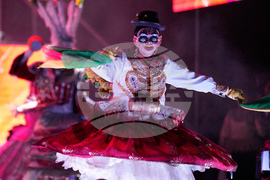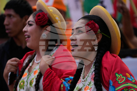 Performers dance during the closing rally of presidential candidate Jorge 'Tuto' Quiroga ahead of the upcoming runoff election in La Paz, Bolivia, Wednesday, Oct. 15, 2025. (AP Photo/Natacha Pisarenko)