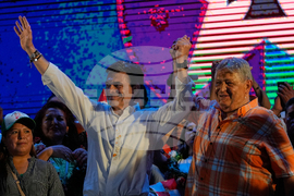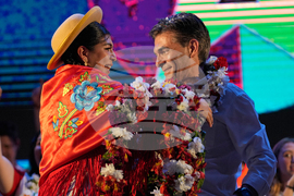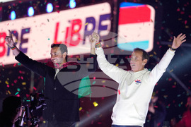 Presidential candidate Rodrigo Paz and his running mate Edman Lara during a closing campaign rally ahead of the upcoming runoff election in Tarija, Bolivia, Wednesday, Oct. 15, 2025. (AP Photo/Juan Karita)
