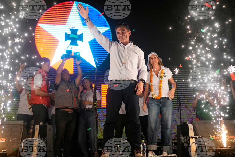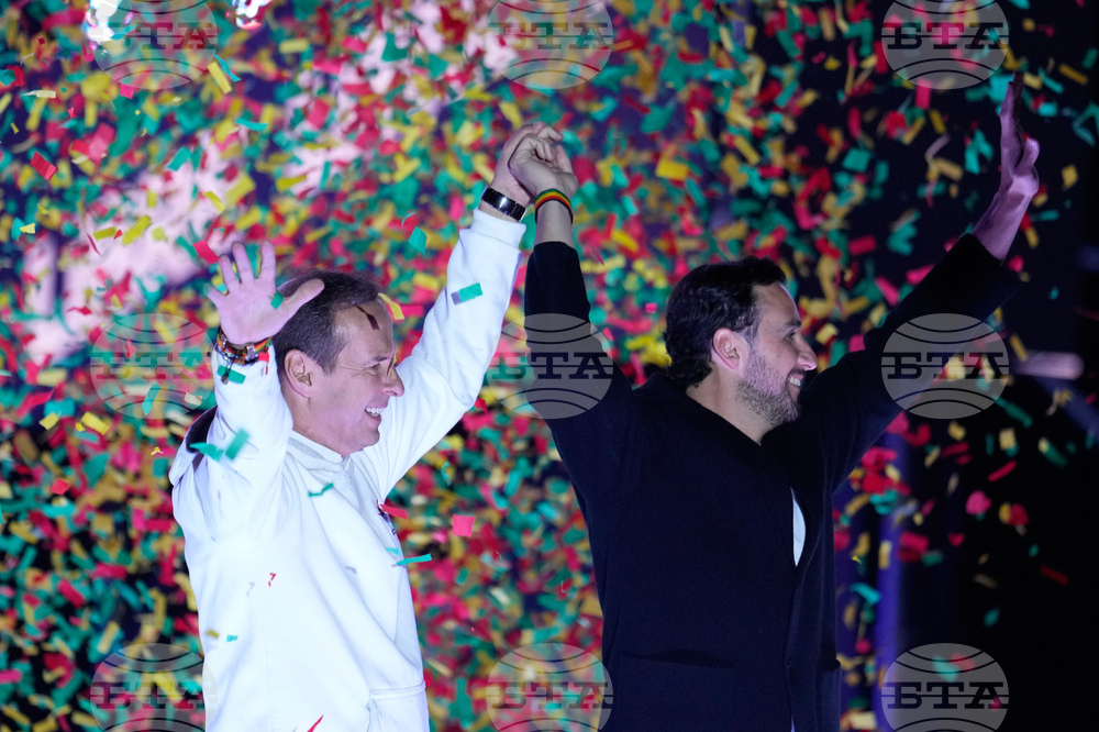 Presidential candidate Jorge "Tuto" Quiroga, left, and his running mate Juan Pablo Velasco wave during a closing campaign rally ahead of the upcoming runoff election in La Paz, Bolivia, Wednesday, Oct. 15, 2025. (AP Photo/Natacha Pisarenko)