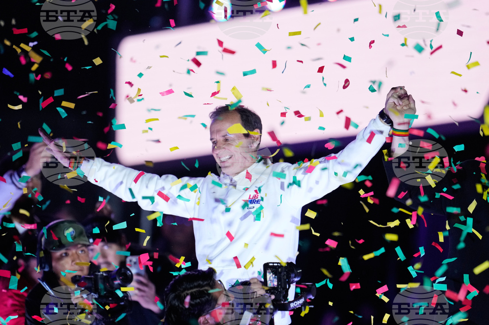 Performers dance during the closing rally of presidential candidate Jorge "Tuto" Quiroga ahead of the upcoming runoff election in La Paz, Bolivia, Wednesday, Oct. 15, 2025. (AP Photo/Natacha Pisarenko)
