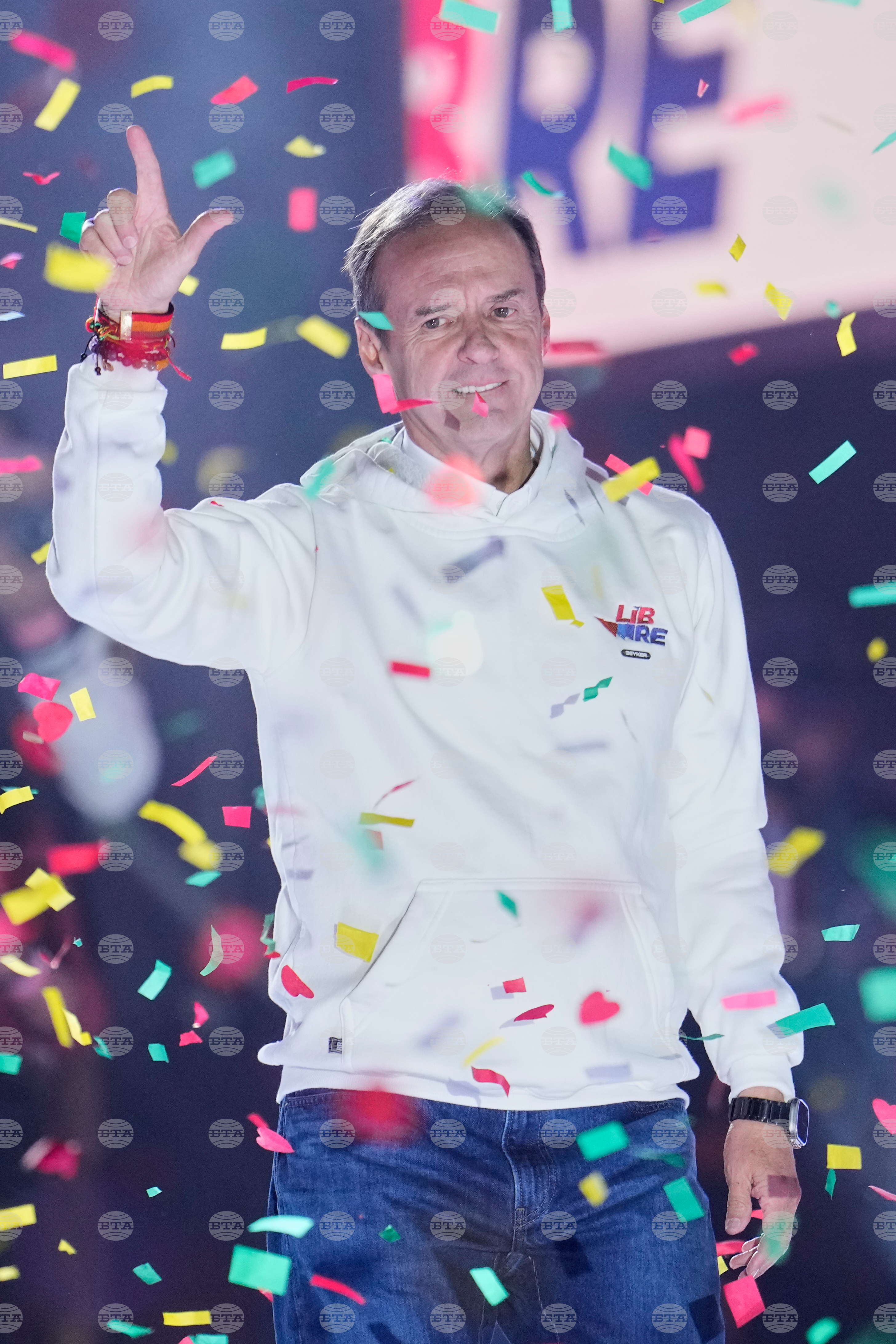 Presidential candidate Jorge "Tuto" Quiroga waves during a closing campaign rally ahead of the upcoming runoff election in La Paz, Bolivia, Wednesday, Oct. 15, 2025. (AP Photo/Natacha Pisarenko)