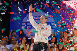 Presidential candidate Rodrigo Paz waves during a closing campaign rally ahead of the upcoming runoff election in Tarija, Bolivia, Wednesday, Oct. 15, 2025. (AP Photo/Juan Karita)