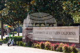 FILE - A sign for the University of Southern California is displayed at a campus entrance in Los Angeles, April 16, 2024. (AP Photo/Damian Dovarganes, File)