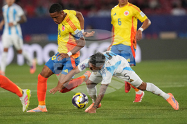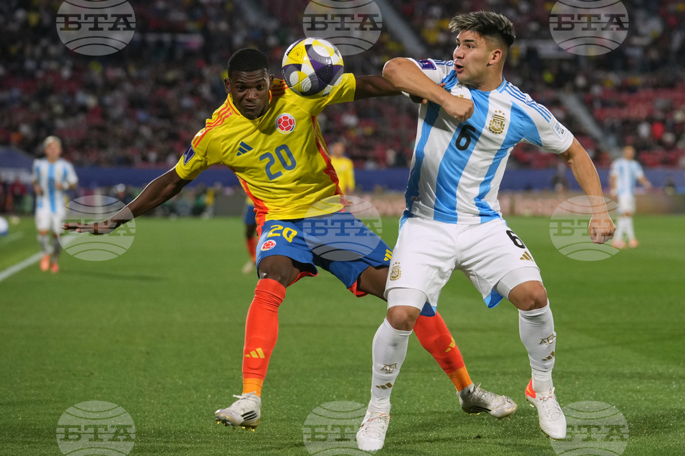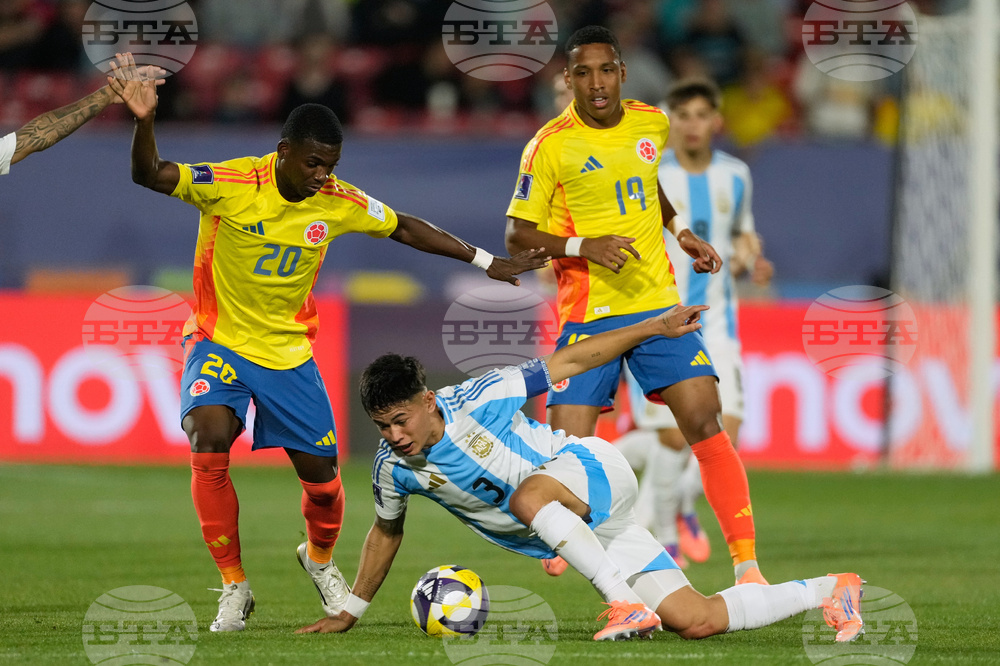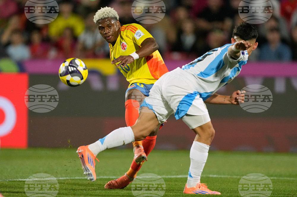 Argentina's Milton Delgado, left, and Colombia's Emilio Aristizabal vie for the ball during a FIFA U-20 World Cup semifinal soccer match at National Stadium in Santiago, Chile, Wednesday, Oct. 15, 2025. (AP Photo/Gustavo Garello)