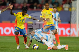 Argentina's Julio Soler falls challenged by Colombia's Joel Canchimbo (20) during a FIFA U-20 World Cup semifinal soccer match at National Stadium in Santiago, Chile, Wednesday, Oct. 15, 2025. (AP Photo/Gustavo Garello)