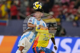 Colombia's Emilio Aristizabal heads the ball over Argentina's Dylan Gorosito during a FIFA U-20 World Cup semifinal soccer match at National Stadium in Santiago, Chile, Wednesday, Oct. 15, 2025. (AP Photo/Esteban Felix)