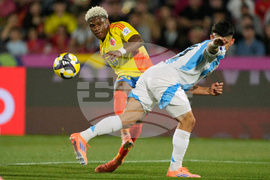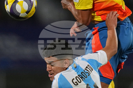 Argentina's Julio Soler heads the ball over Colombia's Joel Canchimbo during a FIFA U-20 World Cup semifinal soccer match at National Stadium in Santiago, Chile, Wednesday, Oct. 15, 2025. (AP Photo/Esteban Felix)