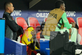 Colombia's Joel Canchimbo covers his face after leaving the field with an injury during a FIFA U-20 World Cup semifinal soccer match against Argentina at National Stadium in Santiago, Chile, Wednesday, Oct. 15, 2025.(AP Photo/Gustavo Garello)