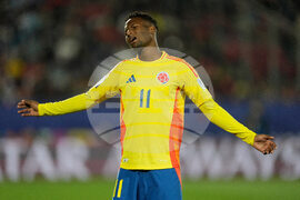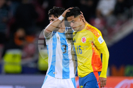 Colombia's Jhon Renteria reacts to a referee's decision during a FIFA U-20 World Cup semifinal soccer match against Argentina at National Stadium in Santiago, Chile, Wednesday, Oct. 15, 2025. (AP Photo/Gustavo Garello)