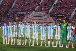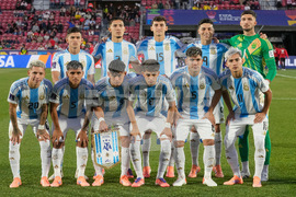 Argentina players pose for a team photo prior to their FIFA U-20 World Cup semifinal soccer match against Colombia at National Stadium in Santiago, Chile, Wednesday, Oct. 15, 2025. (AP Photo/Esteban Felix)