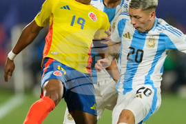 Colombia's Julian Bazan, left, and Argentina's Gianluca Prestianni vie for the ball during a FIFA U-20 World Cup semifinal soccer match at National Stadium in Santiago, Chile, Wednesday, Oct. 15, 2025. (AP Photo/Esteban Felix)