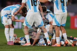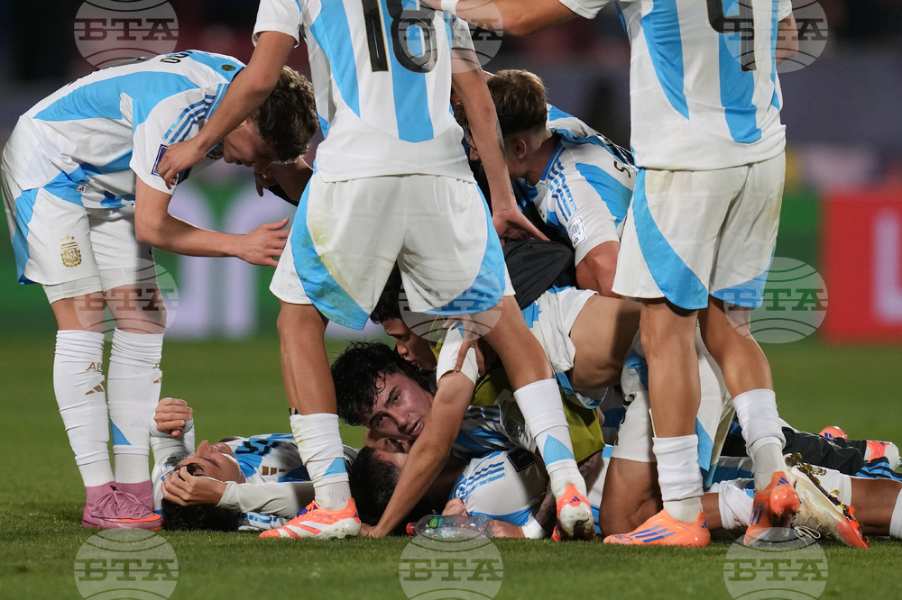 Payers of Argentina celebrate defeating Colombian 1-0 in a FIFA U-20 World Cup semifinal soccer match at National Stadium in Santiago, Chile, Wednesday, Oct. 15, 2025. (AP Photo/Esteban Felix)