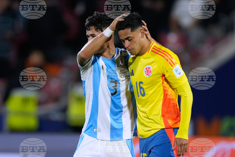 Argentina's Julio Soler conforts Colombia's Joel Romero after their FIFA U-20 World Cup semifinal soccer match at National Stadium in Santiago, Chile, Wednesday, Oct. 15, 2025. (AP Photo/Gustavo Garello)