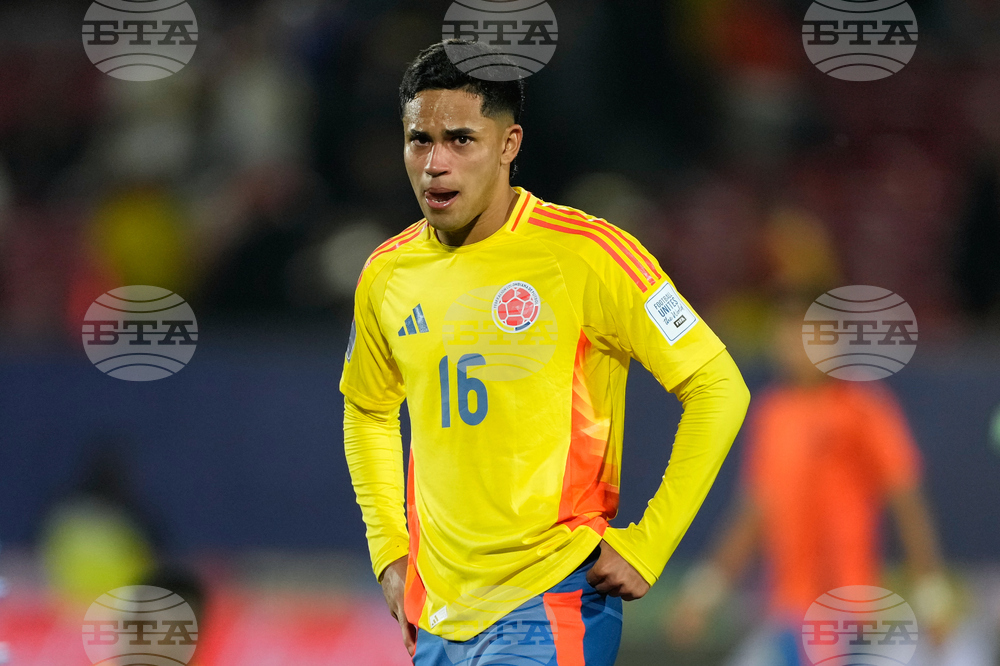 Colombia players pose for a team photo prior to their FIFA U-20 World Cup semifinal soccer match against Argentina at National Stadium in Santiago, Chile, Wednesday, Oct. 15, 2025. (AP Photo/Gustavo Garello)