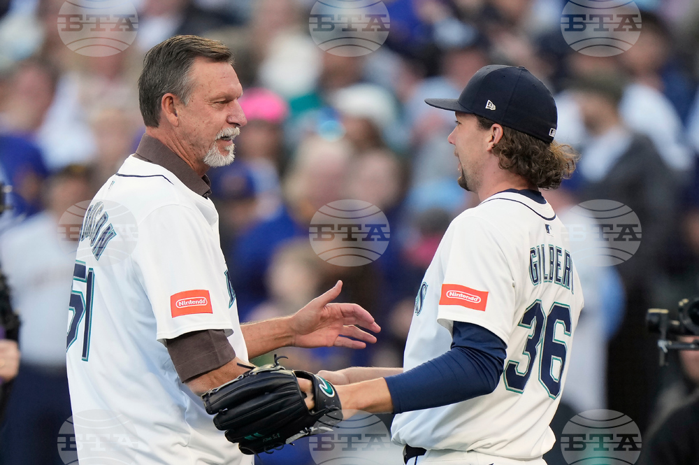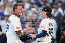 Seattle Mariners pitcher Logan Gilbert (36) shakes hands with former Mariners pitcher Randy Johnson after the ceremonial first pitch ahead of Game 3 American League Championship Series baseball action between the Toronto Blue Jays and the Seattle Mariners in Seattle on Wednesday, Oct. 15, 2025. (Frank Gunn/The Canadian Press via AP)