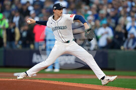 Seattle Mariners pitcher George Kirby (68) delivers a pitch against the Toronto Blue Jays during first inning Game 3 American League Championship Series baseball action in Seattle on Wednesday, Oct. 15, 2025. (Frank Gunn/The Canadian Press via AP)