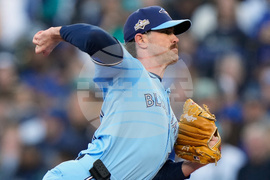 Toronto Blue Jays pitcher Shane Bieber (57) delivers a pitch against the Seattle Mariners during first inning Game 3 American League Championship Series baseball action in Seattle on Wednesday, Oct. 15, 2025. (Frank Gunn/The Canadian Press via AP)