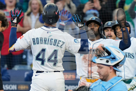 Seattle Mariners' Julio Rodríguez (44) celebrates his two-run home run with Randy Arozarena during first inning of Game 3 American League Championship Series baseball in Seattle on Wednesday, Oct. 15, 2025. (Frank Gunn/The Canadian Press via AP)