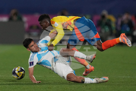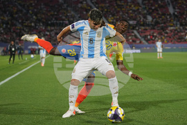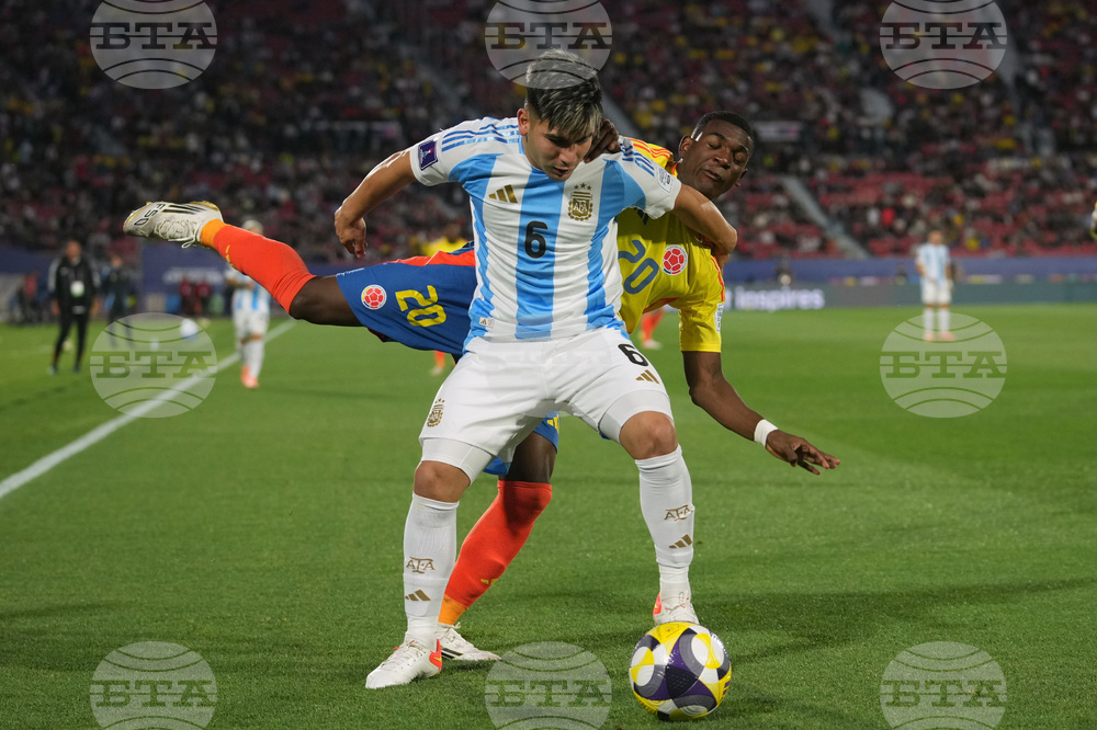 Argentina's Juan Villalba (6) and Colombia's Joel Canchimbo battle for the ball during a FIFA U-20 World Cup semifinal soccer match at National Stadium in Santiago, Chile, Wednesday, Oct. 15, 2025. (AP Photo/Gustavo Garello)