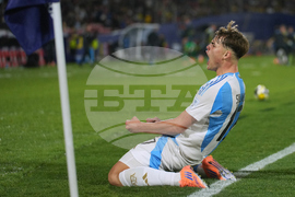 Argentina's Mateo Silvetti celebrates scoring his side's opening goal against Colombia during a FIFA U-20 World Cup semifinal soccer match at National Stadium in Santiago, Chile, Wednesday, Oct. 15, 2025. (AP Photo/Gustavo Garello)